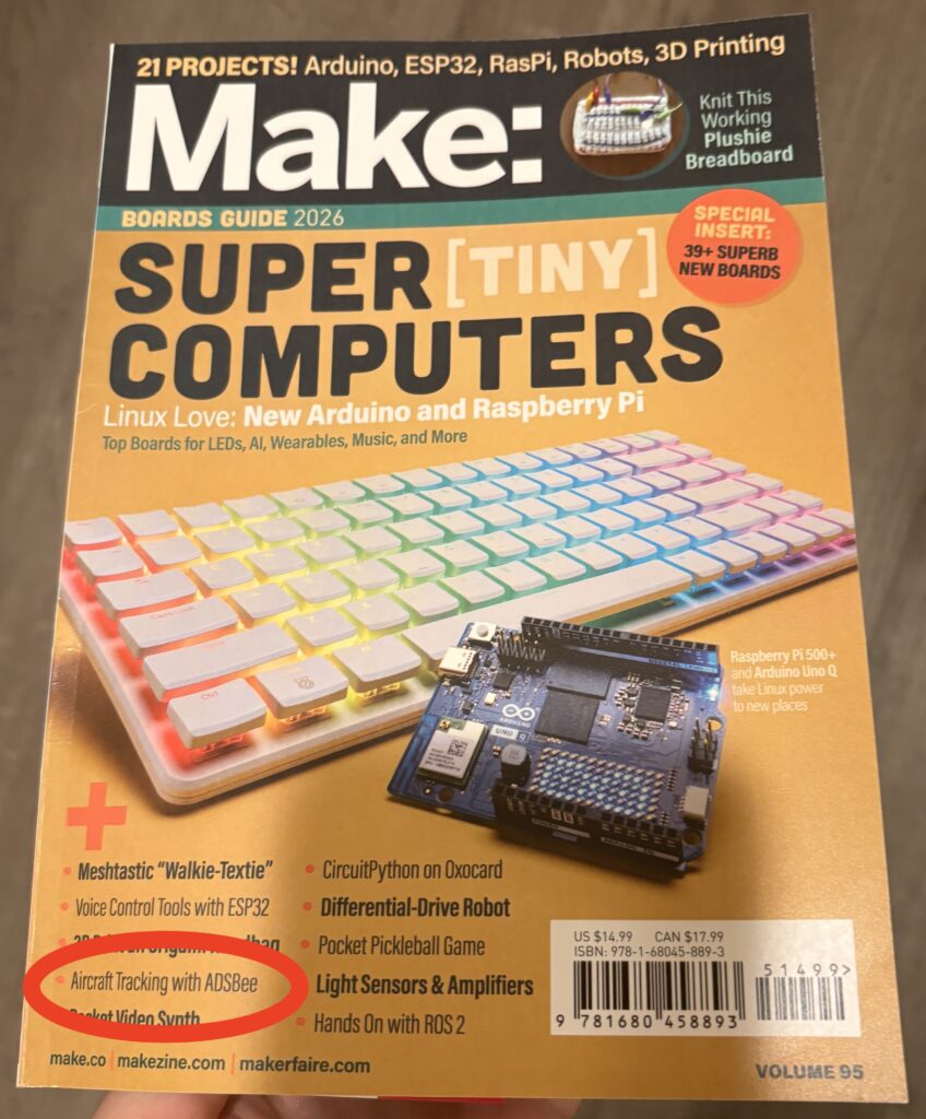 I’m delighted to announce that ADSBee was featured in Volume 95 of Make Magazine! Special thanks to our community members who contributed photos of their projects to the article. It’s a fun read, so I’ve attached a PDF of the proof I received (including a few typos that were fixed in the final edition). As the owner of a copy of Volume 95 of Make Magazine, I can say that it’s a very cool read–I recommend picking up a copy if you have the chance!